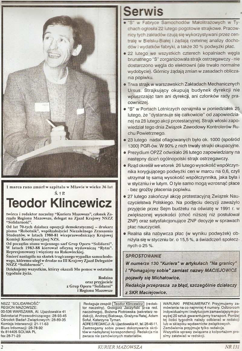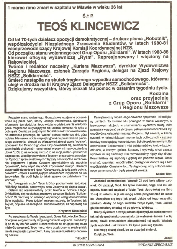 Teodor Klincewicz ur. 05.01.1955 roku w Trzeciakowicach k. Lidy (obecnie Białoruś) – zmarł w szpitalu, w marcu 1991 po wypadku drogowym 01.03.1991 w okolicach Mławy. Absolwent Wydziału Fizyki Technicznej i Matematyki Stosowanej Politechniki Warszawskiej (1984). W latach 70. drukarz i kolporter niezależnych pism i ulotek. W sierpniu 1980 uczestnik strajku w Stoczni Gdańskiej, gdzie zajmował się poligrafią. Od września 1980 w Niezależnym Zrzeszeniu Studentów, od 1981 wiceprzewodniczący Krajowej Komisji Koordynacyjnej NZS. Po 13.12.1981 działacz podziemia. W latach 1982-1989 lider Grup Oporu “Solidarni”, we wrześniu 1982 współtwórca podziemnego pisma “Reduta” (biuletynu informacyjnego Zakładów Mechanicznych im. M. Nowotki). Aresztowany w marcu 1983, zwolniony w lipcu na mocy amnestii. 1983-1988 założyciel i szef podziemnej Oficyny Wydawniczej “Rytm”, 1985-1991 redaktor naczelny “Kuriera Mazowsza” (od 1988 biuletynu RKW Mazowsze).Od 1989 delegat na walne zebrania Regionu Mazowsze, członek ZR; odpowiedzialny za dział informacji i poligrafię warszawskiego biura WKO “Solidarności”. Dyrektor Wydawnictwa Regionu Mazowsze. Zginął w wypadku drogowym w okolicach Mławy.
