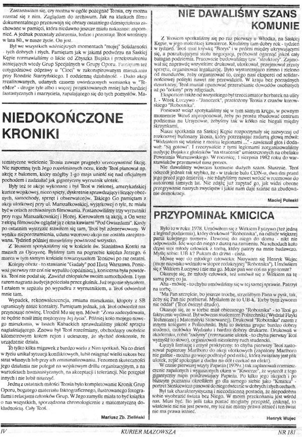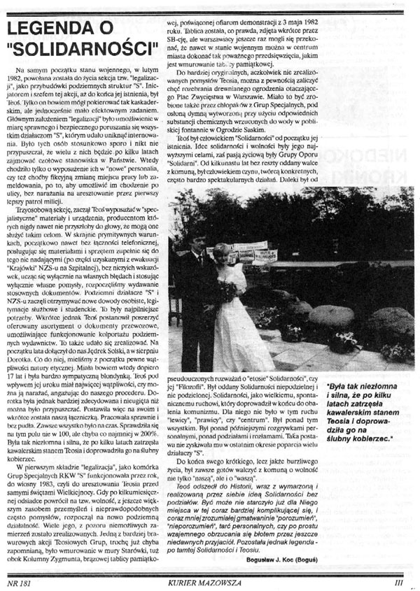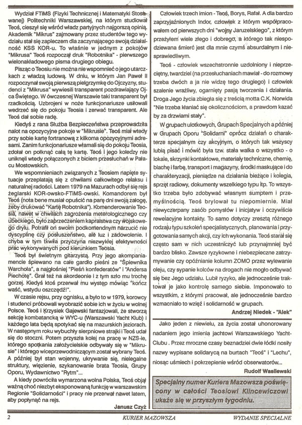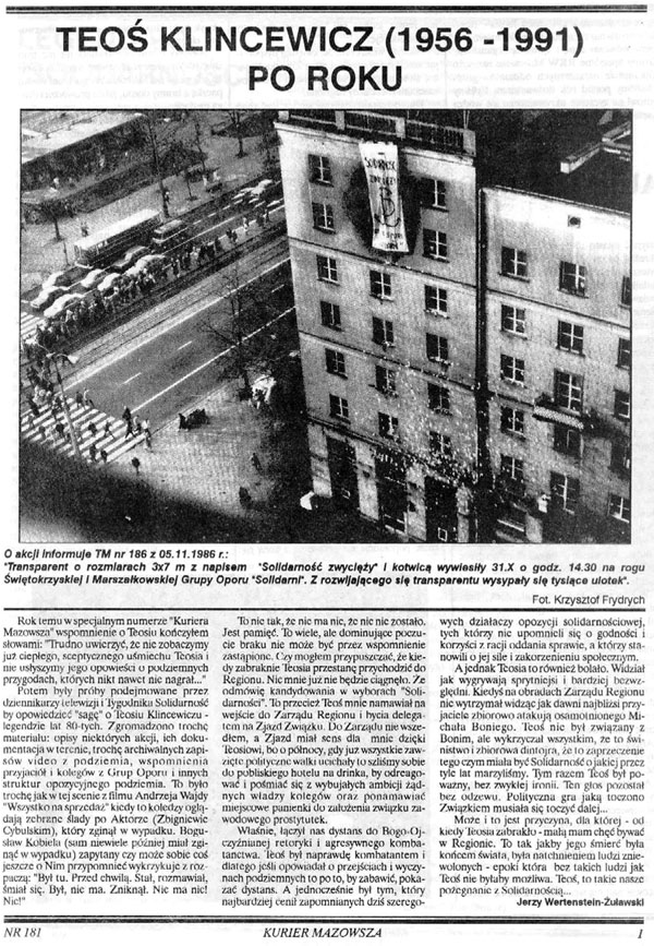 Nazywano go Kmicicem opozycji. Był jedną z najbarwniejszych postaci podziemia po wprowadzeniu stanu wojennego. Jego życiorys mógłby służyć jako temat książek i scenariusz filmów sensacyjnych. Tyle że takie książki i filmy nie powstały, a sam “Teoś” jest dziś postacią zapomnianą. Jego legenda jest wciąż żywa jedynie w środowisku warszawskim. Fakt współpracy z Klincewiczem wśród osób działających w podziemiu wciąż nobilituje.