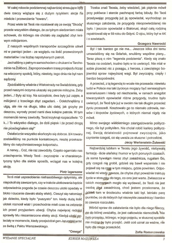 Witold Łuczywo, współpracownik KOR, drukarz “Robotnika”, wynalazca wielu technik usprawniających powielanie drugoobiegowych pism: – To ja jestem za wszystko odpowiedzialny. Wciągnąłem Teosia do drukowania “Robotnika”. Jego przygoda z opozycją zaczęła się w maleńkim pokoiku akademika Mikrus. W oparach rozpuszczalnika, wśród talku, którym trzeba było przesypywać zadrukowane strony, żeby się nie kleiły.