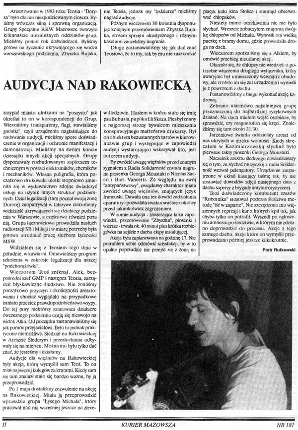 W grypsie z więzienia, który wpadł w ręce SB, Teoś pisał: “Zwinęli mnie 21.03 o godz. 23.25 na tyłach baru mlecznego róg Krucza – Hoża. Czekali tam na kogoś (?). Nie miałem żadnych szans. Znaleźli przy mnie dwa listy Eryka, list Alberta – jest tam o wszystkim. Na listach dopisane były moje uwagi; notes – część adresów udało się zniszczyć. Widziałem się z Maćkiem. Moja przypadkowa wpadka nie ma nic wspólnego z jego. Zwinęli go następnego dnia na lokalu z materiałami. I jest mi strasznie głupio, przykro. Wiem, że takiej głupoty i bezmyślności nie wybacza się. Siedzę, nic nie mówię, nic nie zeznaję. Teoś”.